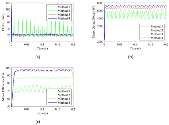 Figure 21 presents the simulation results corresponding to the aforementioned four flow distribution methods, providing a comprehensive analysis and evaluation of the characteristics of the digital hydraulic motor from three key perspectives: flow pulsation, output torque, and efficiency characteristics.