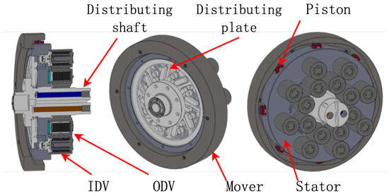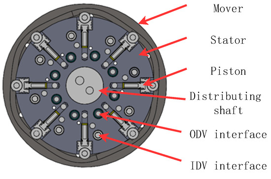 The functional elements of the hydraulic motor are illustrated in Figure 23, which comprises an inner cam rotor, eight pairs of piston units, a flow distribution plate, a flow distribution shaft, eight IDVs, and eight ODVs. The overall architecture of the digital hydraulic motor prototype is notably compact.