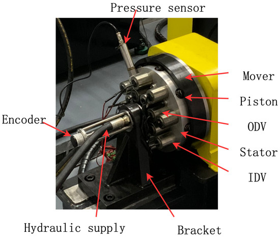 The physical prototype of the radial digital hydraulic motor is shown in Figure 24. To facilitate testing, sensors such as pressure transducers and encoders were installed. The motor shaft is supported in a dual-bearing configuration, while the hydraulic supply and return circuits are routed through the remote end of the fluid distribution shaft, faithfully simulating the spatial constraints of vehicular mounting applications.