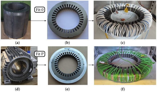 Figure 1b) are produced. The stator laminations have been punched, and the axial packaging is created by welding. The resulting measurement sample is designated Fit 0 and, apart from the axial length, has the same geometric dimensions as the real stator of the prototype machine. Conducting magnetic measurements with the given stator outer and slot base diameters is only possible if the axial stator length is reduced to 25