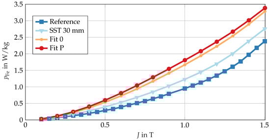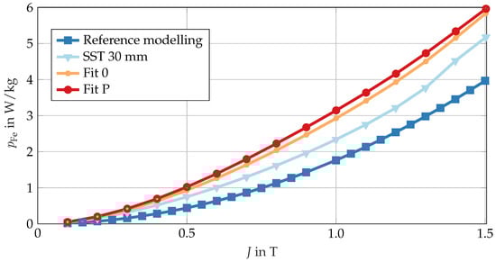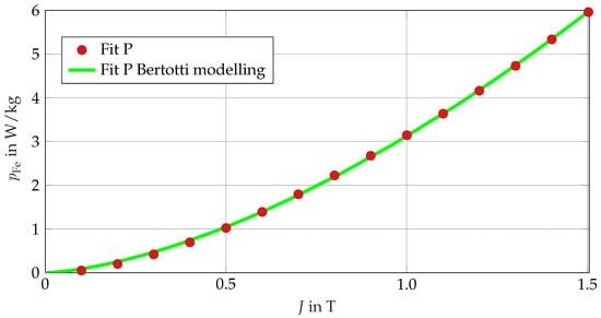 Figure 7, the utilization of the Bertotti model still enables a very good replication of the specific core loss characteristic curve of Fit P. However, it should be noted that the hysteresis loss and excess loss components determined therein have become devoid of any physical reference. A notable benefit of this approach is its compatibility with a range of pieces of finite element analysis software that support the Bertotti methodology.