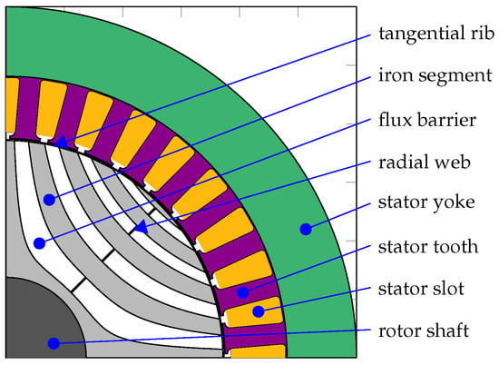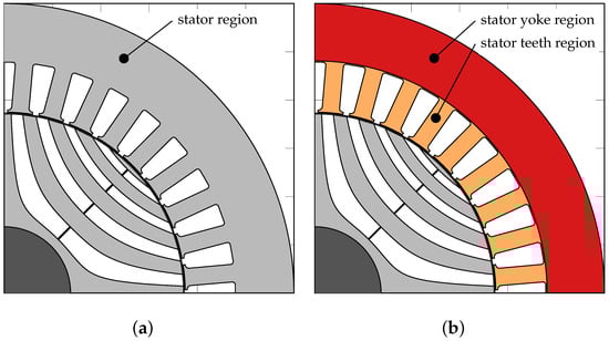 Figure 9b delineates the distinction between the stator yoke region and the stator teeth region. This provides the opportunity to assign different material parameters to the stator to take into account the investigated manufacturing influences.