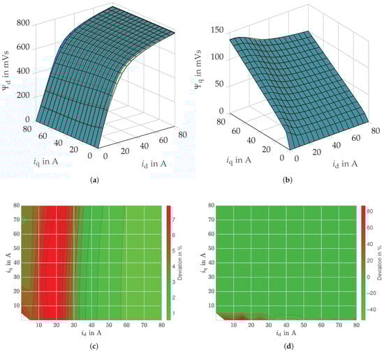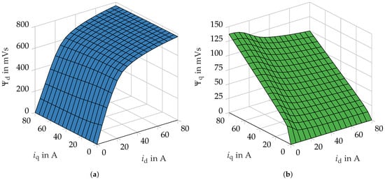 Due to the low frequency, the core losses can be neglected when measuring the flux linkage maps. The current angle is set from to for different current amplitudes, ranging from to via the current control. The electrical and mechanical measured variables are recorded in the time domain.