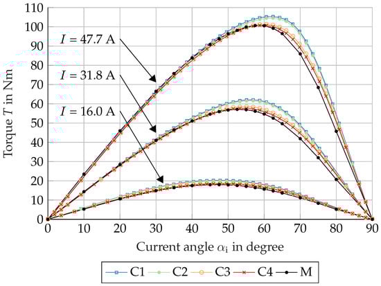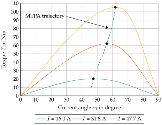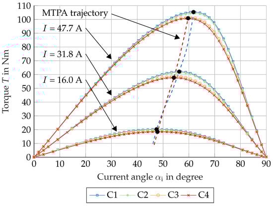 . The maximum is necessary to determine the trajectory for the maximum torque per ampere (MTPA) control method. The torque and the associated current angle depend on the material parameters and, consequently, exert an influence on the calculation result.