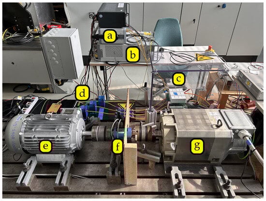 Figure 13, the motor test bench is equipped with a prototype of a RSM (e) that is coupled to a load machine (g) via a torque measuring shaft (f). The load machine has a rated power of