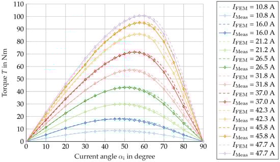 Figure 14, the measurement results demonstrate a strong correlation with the FEA results. When manufacturing influences are taken into account, a significant improvement in the calculation results compared to the measurement results can be achieved. The slight deviations observed in the torque values and the current angle of the descending branch can be ascribed to the fact that the air gap torque is determined in the FEA. In the context of experimental analysis, the shaft torque will be lower than that calculated in the FEA due to friction and ventilation losses.
