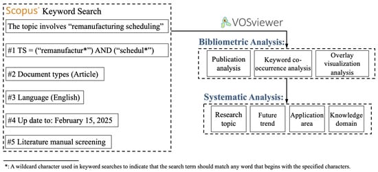 The motivation of this paper is to provide an up-to-date review of the development of remanufacturing scheduling. A combined-review method was employed, covering data acquisition, bibliometric analysis, and a systematic review. The overview of the proposed research method is shown in Figure 1. Scopus is applied to collect data, complemented with a manual screening of the literature to ensure the inclusion of high-quality and pertinent documents. The bibliometric analysis is then conducted using a software tool, VOSviewer, to show the publication analysis, keyword co-occurrence analysis, and overlay visualisation analysis. These analyses provide insights into the research topics, future trends, application areas, and knowledge domains within the field of remanufacturing scheduling, thereby offering a comprehensive overview of the current state and potential directions of research in remanufacturing scheduling.