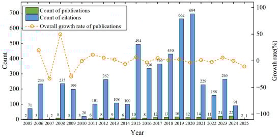 Count of publications, count of citations each year, and growth rate of publications in the area of remanufacturing scheduling (2005–2025).