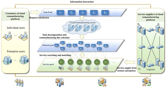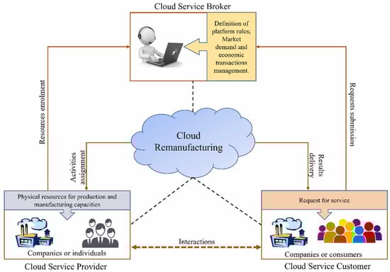 Distributed or cloud-enabled systems virtualise remanufacturing resources across geographically dispersed service providers. Tasks (or task fragments) are published to a cloud platform that orchestrates service composition, resource reservation, and data exchange. Figure 6 illustrates a typical cloud-remanufacturing architecture [6], where physical capacities owned by multiple companies or individuals are virtualised and exposed as services through a central platform. Customers submit repair or refurbishment requests, which are matched by the cloud service broker to suitable providers according to platform policies, current market demand, and negotiated service-level agreements. The broker then decomposes each request into elementary activities, reserves the required resources, and coordinates data exchange until results are returned to the customer.