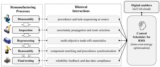 Bilateral interactions of remanufacturing processes, digital enablers, and central scheduler of RMS.