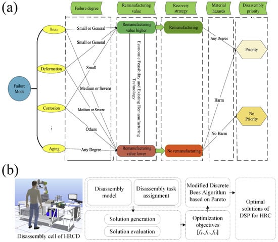 Disassembly for remanufacturing systems: (a) optimisation method of disassembly line balance with variable remanufacturing damages and material hazards [51] and (b) workflow of the disassembly sequence planning for human–robot collaboration [53].