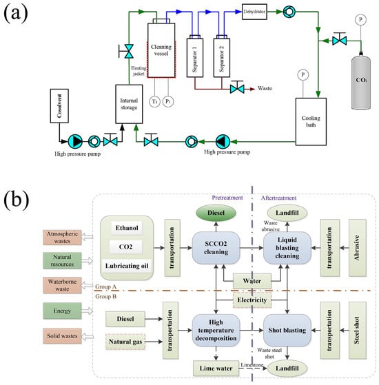 Remanufacturing cleaning: (a) SCCO2 cleaning apparatus [59]; (b) cleaning processes indicating the system boundary of four remanufacturing cleaning methods, including SCCO2 cleaning, liquid blasting cleaning, high temperature decomposition and shot blasting [60].