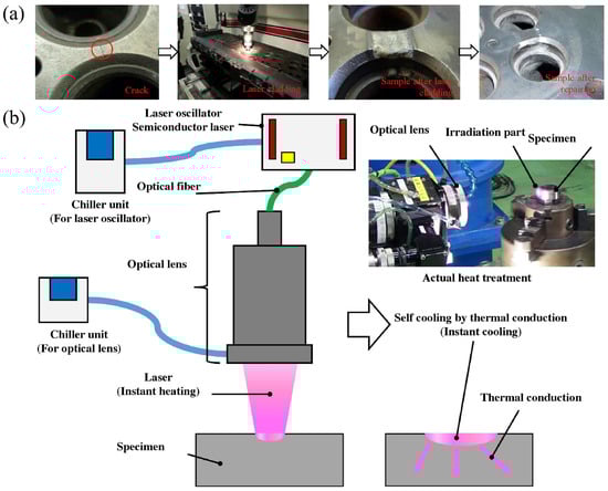 Laser cladding for remanufacturing: (a) cylinder head laser cladding remanufacturing [62]; and (b) setup for laser hardening process based on laser cladding [64].