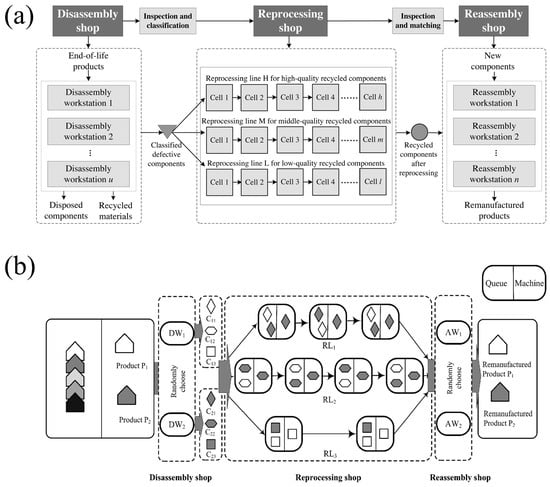 In a centralised setting, all macroscopic phases are co-located within a single facility. A typical centralised remanufacturing system consists of three stages: a disassembly shop, a reprocessing shop, and a reassembly shop [20]. Disassembly, reprocessing, and reassembly operations share common physical resources; transportation delays between stages are, therefore, negligible, yet resource contention is acute. A crucial principle to adhere to is that the remanufacturing tasks across these three stages must be executed in a prioritised sequence [21,22]. Given the heterogeneity of reprocessing requirements, centralised remanufacturing systems fall into two configurations: (i) flow-shop remanufacturing systems suited to high-volume, low-variety returns, and (ii) job-shop remanufacturing systems designed for low-volume, high-variety returns [14]. Uncertainty manifests primarily as variable processing times, stochastic machine failures, and the heterogeneous quality of incoming cores, which influences route selection and processing requirements [23].