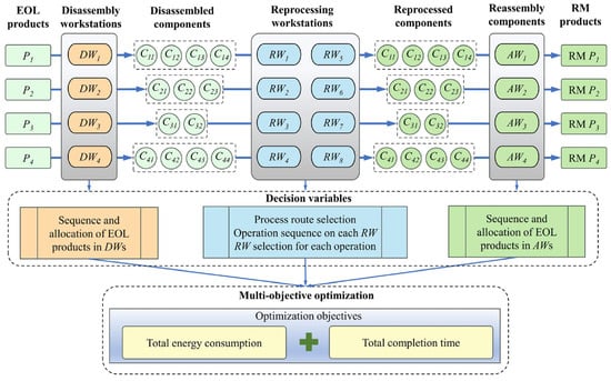 A typical remanufacturing chain comprises five tightly coupled stages: disassembly, inspection, reprocessing, reassembly, and final testing [4,5]. Unlike conventional manufacturing, each returned core may follow a bespoke route, driven by its unique quality state and customer requirements. Scheduling, therefore, becomes the “control centre” of the remanufacturing shop: it must allocate heterogeneous resources, synchronise serial and parallel flows, respect precedence constraints, and react to stochastic arrivals and machine disruptions, under cost-, energy-, and carbon-reduction targets. In distributed or cloud-based ecosystems, the challenge intensifies: tasks, resources, and data can be geographically dispersed and virtually orchestrated, demanding new optimisation paradigms [6].