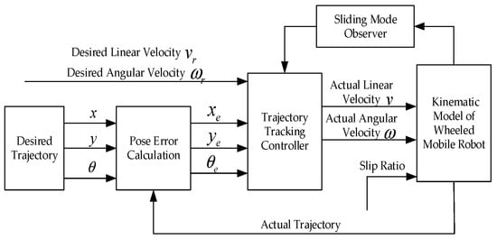 To address slip effects, several studies have explored trajectory tracking control under sliding conditions. Wang et al. [] proposed an active disturbance rejection control strategy capable of accurately observing disturbances, thereby improving robustness and maintaining trajectory tracking performance during slip events. Li et al. [] developed an anti-saturation fuzzy super-spiral sliding mode control to mitigate slip disturbances, effectively reducing chattering. Jia et al. [] designed a backstepping controller capable of automatically compensating for unknown wheel slip disturbances, improving tracking accuracy, anti-interference capability, and robustness. Nevertheless, these methods do not explicitly estimate slip parameters in real time or analyze the slip ratio in detail. In summary, this study addresses the critical challenge of trajectory tracking control for wheeled mobile robots operating under unknown slip conditions, where conventional methods often fail to achieve satisfactory accuracy and robustness. The proposed approach introduces two key innovations: (1) an improved rapid variable exponential reaching law-based controller that ensures stable tracking within finite convergence time despite unknown slip ratios, and (2) a sliding mode observer for real-time slip parameter estimation. By integrating these components, the proposed framework achieves rapid convergence of tracking errors to zero, thereby enabling reliable trajectory tracking and motion control, even under significant slip conditions. The control block diagram was shown in Figure 1. The sliding mode observer performs real-time estimation of slip parameters, while the trajectory tracking controller dynamically adjusts the control law based on both the observer’s outputs and the pose errors of the wheeled mobile robot, ensuring that stable tracking can be achieved within a finite convergence time even under unknown slip ratio conditions.