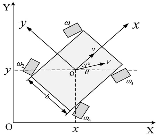 As shown in Figure 2, it is assumed that the geometric center of the wheeled robot coincides with its center of mass, and the overall coordinate system is established with reference to the geodetic coordinate system. xoy is a local coordinate system, which is established with reference to the robot’s own coordinate system. The geometric center of the vehicle body is represented by the point O(x,y) in the global coordinate system; the θ is the angle between the forward direction of the robot’s head and the positive direction of the X-axis of the overall coordinate system []. is the linear velocity of the robot. When the robot is moving, the wheels on the same side rotate at the same speed, that is, , , let and represent the angular velocities of the left and right sides of the wheel, respectively, and let and represent the velocities of the left and right wheel centers, respectively.
