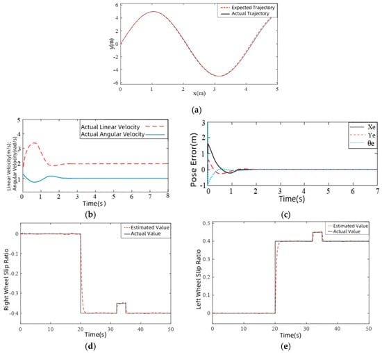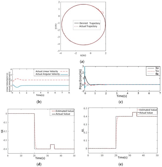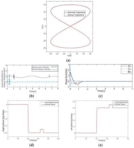 From Figure 4 and Table 1, it can be observed that the robot’s pose errors , , and converge to 0 within 0.66 s, 0.51 s, and 0.76 s, respectively. This means that the robot fully tracks the desired circular trajectory after 0.76 s. The robot’s linear velocity and angular velocity converge to the desired values within 1.37 s and 1.24 s, respectively. And after only one oscillation, the steady state is reached, which indicates that the whole tracking process runs smoothly and is hardly affected by the slip rate. As shown in Figure 4d,e, the sliding mode observer can accurately predict the slip ratio, which is the foundation for good trajectory tracking performance.