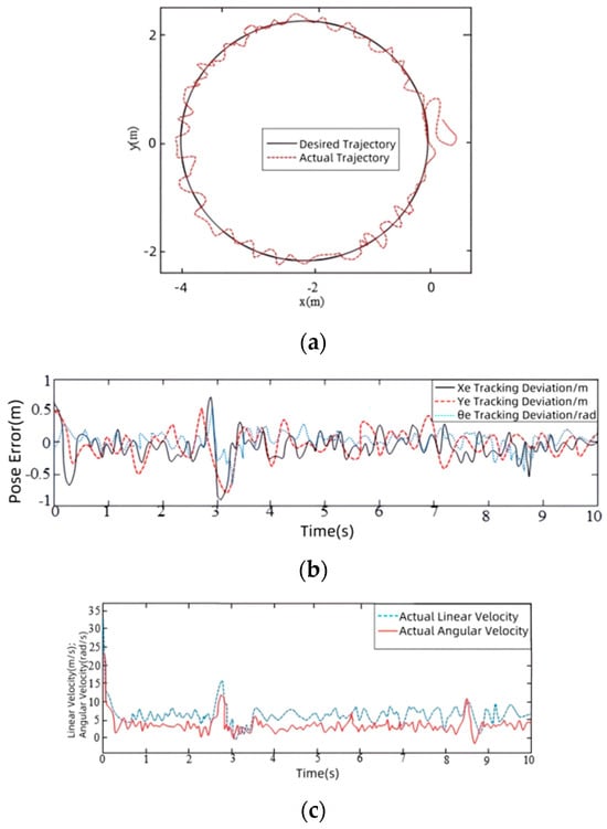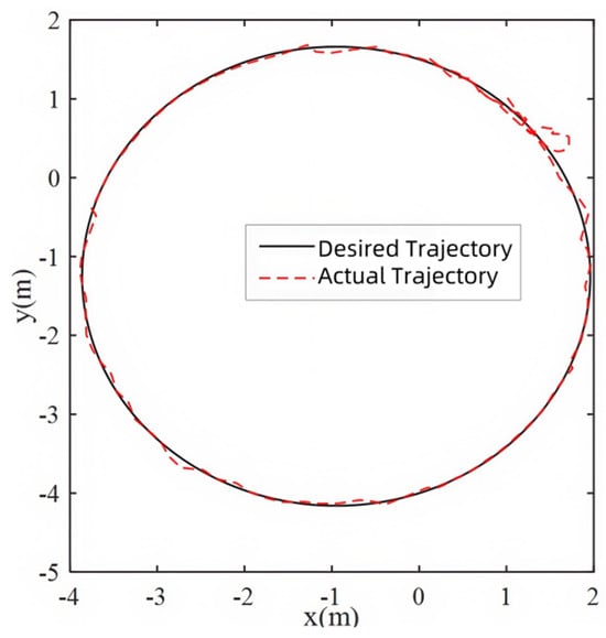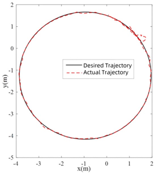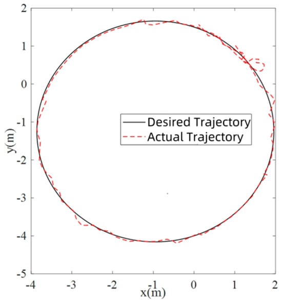 - Due to the ability of fuzzy PID controller to adjust PID parameters in real time according to environmental changes, it has strong environmental adaptability and robustness. Therefore, in this section, the fuzzy PID control algorithm was used to design a trajectory tracking controller. Other experimental conditions remain unchanged; the result of tracking the circular trajectory is shown in Figure 9.