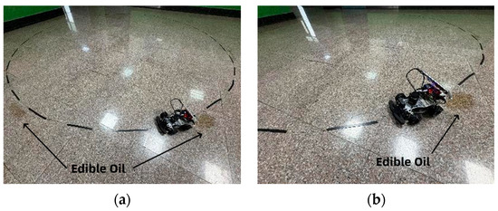 To validate the effectiveness of the trajectory tracking controller designed in this paper in the actual environment, experiments were conducted using a wheeled mobile robot. The physical parameters of the robot are as follows: overall mass m = 3 kg, distance between front and rear wheels l = 0.2 m, and the distance from the center point to the side of the wheel d = 0.1 m. Edible oil was poured on the ground to make the wheels slip, as shown in Figure 10, where the radius of the circular trajectory is 2 m, and the dashed line represents the given motion trajectory for the robot. The specific experimental results are shown in Figure 11.