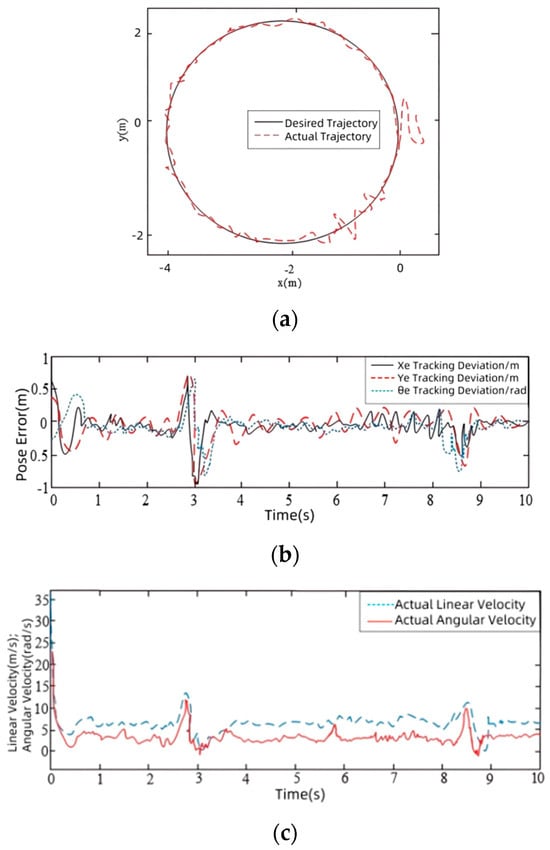 Tracking results of rapid double power reaching rate in a real environment. (a) Tracking circular trajectory curves. (b) Trajectory tracking linear velocity and angular velocity curves. (c) Trajectory tracking pose error curve of robots.