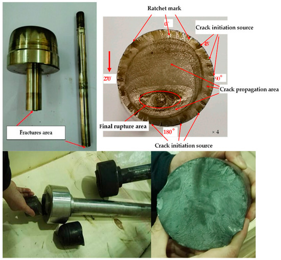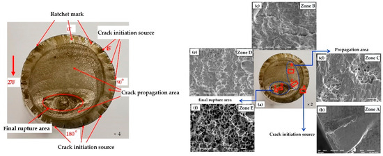 SEM images of the fracture surface. (a) SEM observation locations of the fracture. (b) Fracture pattern of Area A at the crack source (300×). (c) Fracture pattern of B crack propagation area (800×). (d) Fracture pattern of C crack propagation area 5 (800×). (e) Fracture pattern of D final fracture area (1000×). (f) Fracture pattern of E final rupture area (1000×) [4].