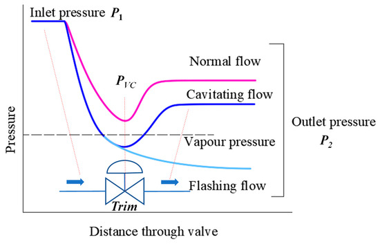 Industrial energy systems frequently operate under high-pressure and high-temperature conditions to maximize efficiency and economic benefit. This high-parameter environment poses significant challenges for local throttling devices, particularly control valves, where the passage of high-pressure fluids can generate complex flow phenomena. These phenomena induce mechanical vibration, flow fluctuations, and intense noise, impacting system stability and environmental compliance. Flow-induced noise encompasses several mechanisms, including turbulence-generated noise, cavitation noise, and flash vaporization noise [96]. When fluid flows through the narrow throttling regions of a control valve, its velocity increases while the pressure drops, according to the principle of energy conservation. If the working fluid is a liquid and the local pressure falls below its vapor pressure, vapor bubbles begin to form—this is commonly referred to as flashing. If the pressure subsequently recovers above the vapor pressure downstream, these vapor bubbles may collapse abruptly, causing cavitation. Figure 5 schematically illustrates this process by showing the typical pressure profile across a control valve. It is important to distinguish between flashing and cavitation: flashing refers to vapor formation due to pressure drop, while cavitation involves vapor collapse and the associated pressure surges and vibrations.