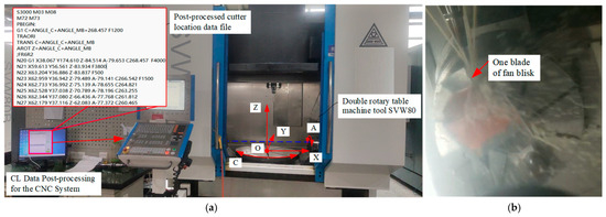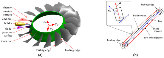 Blisks are complex thin-walled parts with specific structures that have narrow channels and a large degree of bowed-twisted blades. The blisk integrates the blades and disk into a single monolithic structure, thereby reducing part count and weight, minimizing aerodynamic losses, and preventing potential crack initiation and propagation at joints. Future engines featuring high thrust-to-weight ratios and large bypass ratios will necessitate even more complex blisk geometries, imposing stricter requirements on manufacturing technologies [1,2]. Five-axis Computer Numerical Control (CNC) machining technology has gained widespread application in the manufacturing of large fan blisks due to its advantages of rapid response, high reliability, excellent machining flexibility, and short production lead time [3,4,5]. The axis machining technology is directly relevant to blisk surface quality and production, and it remains one of the bottlenecks restricting the development of high-performance aero-engines.