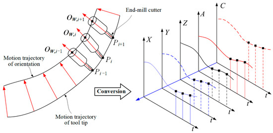 In Equation (4), the Jacobian matrix J is composed of four sub-matrices. And for the symbols of JTT, JTR, JRT, and JRR, the first subscripts T and R of the sub-matrix denote the affected tool tip point and tool axis vector, respectively, while the second subscripts T and R of the sub-matrix represent the influence of the linear motion axis and rotational motion axis of the machine tool on the tool attitude, respectively.