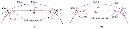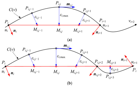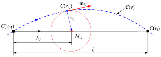 The deviation direction of the interpolated curve path of the straight-line segment is the same as that of the vector , while the deviation value εi,j can be calculated from Equation (3).