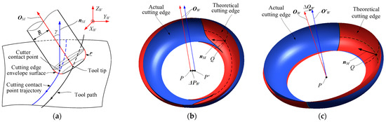 Similar to the tip deviation of the tool, the vector deviation of the tool axis will also alter the meshing relationship between the rotary surface of the cutting edge of the tool and the machined curved surface, thereby causing overcutting or undercutting at the theoretical tangent point, as illustrated in Figure 8b. The plane defined by vector O′W and vector nM is denoted as πM, with its normal vector represented by tM. And the plane perpendicular to both plane πM and vector nM is denoted as πM, with its normal vector represented by tm. Then the vectors tM and tm can be derived from Equation (9).