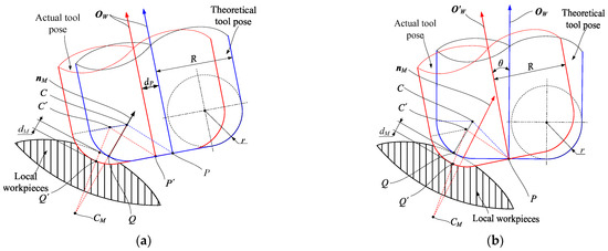 Thus, under the combined effect of cutter tip point deviation and cutter axis vector deviation, the maximum overcut depth or minimum undercut thickness dM at the theoretical cutting contact point can be calculated by Equation (14). Here, lP and lθ are algebraic values and independent of each other, so the combined effect of cutter tip point deviation and cutter axis vector deviation may either have an additive effect or offset each other.