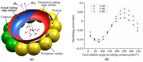 It should be noted that in Equation (14), lP and lθ are independent of each other and each can be either positive or negative. Therefore, the combined effect of cutter tip point deviation and cutter axis vector deviation may either amplify or cancel each other out, depending on the direction of deviation, as illustrated in Figure 9a. Figure 9b presents the distribution of machining errors along the cutting contact point positions under the condition of cutter tip point deviation ΔPW = [0.1, 0.1, 0.1]Tand cutter axis vector deviation ΔOW = [0.0, 0.99999, −0.00436]T for different tool rake angles. In Figure 9b, the tool rake angle γ is defined as the angle between the cutter axis vector O (aligned with the positive zR axis direction in Figure 9a) and the normal vector, while the circumferential angle refers to the angle between the projection vector of the normal vector nM in the xR-yR plane and the positive xR axis. As observed in Figure 9b, under identical cutter tip point deviation and cutter axis vector deviation, the machining error at the cutting contact point on the machined surface varies with the position of the cutting contact point on the tool’s rotational surface. Furthermore, the depth of overcutting or undercutting at the cutting contact point differs based on the location of the cutting contact point on the tool’s rotational surface.