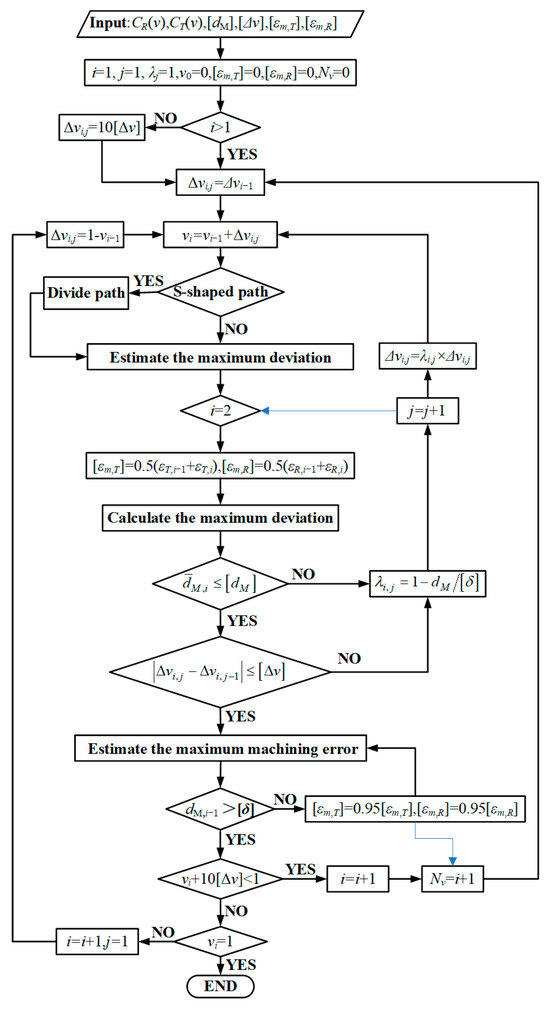 Based on the preceding analysis, Figure 11 presents the flowchart of the curve parameter search algorithm for optimal cutter location points under constant tolerance constraints. When implementing the search algorithm shown in Figure 11, the input parameters include synchronized motion trajectory curves for machine tool linear axes and rotary axes CT(v) and CR(v), maximum permissible machining error [dM], adjacent search step resolution [Δv], and initial corner transition thresholds [εm,T] = 0 and [εm,R] = 0. The algorithm outputs the number of ordered linear path segments Nv, the curve parameter vi at the terminal endpoint of the i-th linear path segment, and the maximum allowable thresholds for linear interpolation path [εm,T] and [εm,R]. During the optimal cutter location point search process, the average of maximum deviations in motion trajectories along the first two linear paths is set as the initial threshold for linear paths. Starting from the third linear path endpoint search, machining errors from both linear interpolation and corner transitions are evaluated simultaneously. Moreover, when the latter exceeds the former, it is necessary to reduce thresholds at corner transition paths and recalculate the machining error upper bound. By means of this algorithm, linear interpolation paths with minimal redundant points can be obtained, and machining errors are maintained within constrained tolerance limits.