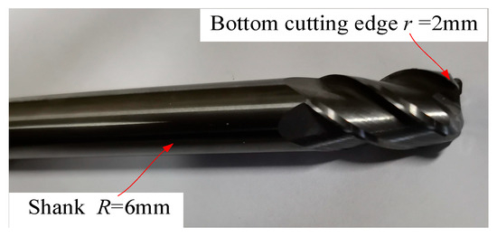 The fan blisk structure is identical to that shown in Figure 1. Its outer hub diameter is approximately 803.0 mm, while the inner hub diameter ranges between 477.2 mm and 523.2 mm. The blade surfaces are free-form surfaces, with a maximum length of approximately 163.0 mm and a width of about 112.5 mm. Additionally, the maximum blade thickness is 4.35 mm, while the minimum radius of curvature in the leading and trailing edge regions is 0.176 mm. The material of the fan blisk is titanium alloy TC4. To reduce vibration and deformation during the machining process, the prebliskion machining of blades is divided into two stages: semi-finishing and finishing. During the semi-finishing and finishing of blade of fan blisk, a hard alloy toroidal end-mill cutter with shank radius R = 6 mm and bottom cutting edge radius r = 2 mm is used, as shown in Figure 12. The cutter is purchased from Zhuzhou Diamond Cutting Tools Co., Ltd. in Zhuzhou, China. Without loss of generality, the toolpath element position selected for the semi-finishing stage of the blade surface is shown in Figure 13. And the permissible machining error upper limit is set as 0.04 mm, and the allowance of 0.1 mm is reserved for subsequent prebliskion finishing.