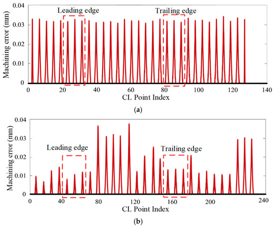 The statistical results of maximum machining deviations across linear interpolation path segments obtained by the above two methods are presented in Figure 14, where, for enhanced clarity, Figure 14a displays maximum values taken over every five adjacent cutter location points, while Figure 14b shows the maxima calculated over every ten adjacent cutter location points. As observed in Figure 14a, the maximum machining errors along linear paths corresponding to discrete cutter location points generated via the constant machining error constraint method are primarily distributed within a narrow range of 0.031 mm~0.034 mm with deviation uniformity, specifically showing minimum machining error at 77.5% of theoretical maximum error and maximum machining error at 85% of the theoretical maximum error. The failure to achieve theoretical error limits stems from conservative estimations during computation: conservative conversion from machine tool linear/rotary axis motion deviations to cutter tip/axis deviations and conservative estimation when calculating maximum machining errors on linear paths based on tool pose deviations. However, the deviations between maximum machining errors on each linear path generated by the constant chord height tolerance constraint method and theoretical values are more significant. As observed in Figure 14b, maximum machining errors across linear paths are distributed within the range of 0.007 mm~0.038 mm, where the minimum machining error on paths is only 17.5% of the theoretical maximum error while the maximum machining error reaches 95% of the theoretical maximum error. This dispersion of maximum machining errors stems from the fact that machining errors induced by cutter tip deviation and cutter axis deviation may act either in the same direction or opposite directions: when error directions coincide, the maximum deviation on linear paths increases, whereas when directions oppose, the deviation decreases. Against the baseline constant chord height control, the constant machining error constraint strategy enhances the consistency of theoretical machining errors at tool position points. Specifically, the error fluctuation band narrows from an initial 17.5%~95% amplitude to a controlled 77.5%~85% band.
