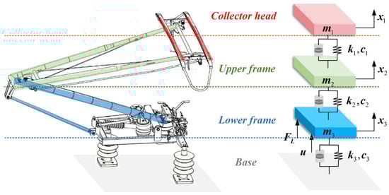Numerous pantograph models have been developed for specific research objectives [,]. However, simpler approaches—such as the two-mass model in [,]—cannot fully capture the pantograph’s overall structural response. Therefore, we adopt a more comprehensive three-mass model to represent the pantograph’s three main components—the collector head, the upper frame, and the lower frame—as illustrated in Figure 3. The three-mass model is sufficient to characterize the pantograph’s dynamic behavior and has been validated in [].