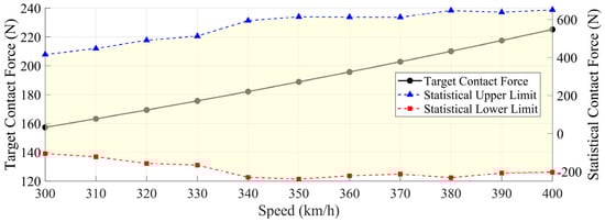Target contact force values and the statistical contact force ranges under passive control for speeds from 300 km/h to 400 km/h.