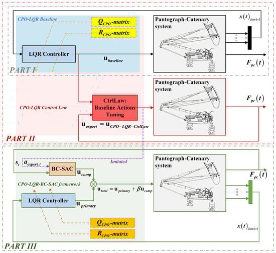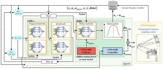 - Expert Action Refinement—Part II:Based on the dual pantograph–catenary model, design an offline control law (CPO-LQR-CtrlLaw) to perform a secondary optimization of the baseline actions, producing ideal control actions that surpass the baseline performance—these are treated as expert actions for the agent’s policy to imitate.