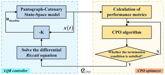 CPO’s strength lies in its superior global search capability, which allows it to thoroughly explore large solution spaces and avoid local optima. Leveraging this advantage, the algorithm performs deep optimization of the -matrix’s six weighting coefficients corresponding to the system’s state variables, identifying the optimal combination to maximize the suppression of pantograph–catenary contact force fluctuations and significantly enhance the overall control performance. Following the objective function designed in Section 2.3.2, the corresponding optimization mechanism is illustrated in Figure 7.