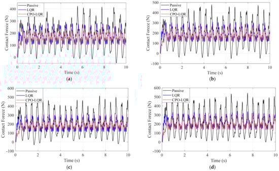 where denotes the mean contact force; is the contact force standard deviation under active control; is the contact force standard deviation under passive control; and is the safety threshold for the contact force standard deviation, set to 30% of the mean contact force. The first term reflects the degree to which the fluctuations’ amplitude exceeds acceptable levels. The second term quantifies the deviation of the mean contact force from the target value, using an absolute value to capture deviations when the mean is above the target or below the lower bound. The third term is a fixed penalty: a constant +10 is added to assign a large fitness value to severe violations, guiding the optimization algorithm to avoid such solutions. When all constraints are satisfied, the fitness value is determined solely by the first term . The optimization objective is thus reduced to minimizing this standard deviation to suppress contact force fluctuations while maintaining the mean contact force around the target value.