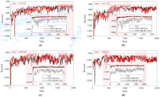 To comprehensively evaluate the contribution of each module in the proposed framework to control performance, we compared three schemes: the standalone SAC, the combined framework with CPO-LQR as the primary controller and the SAC as the compensatory controller, and the proposed framework with the added behavior-cloning loss term. Their reward convergence curves are shown in Figure 14.