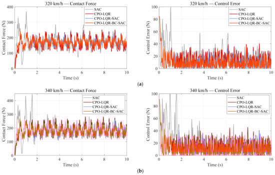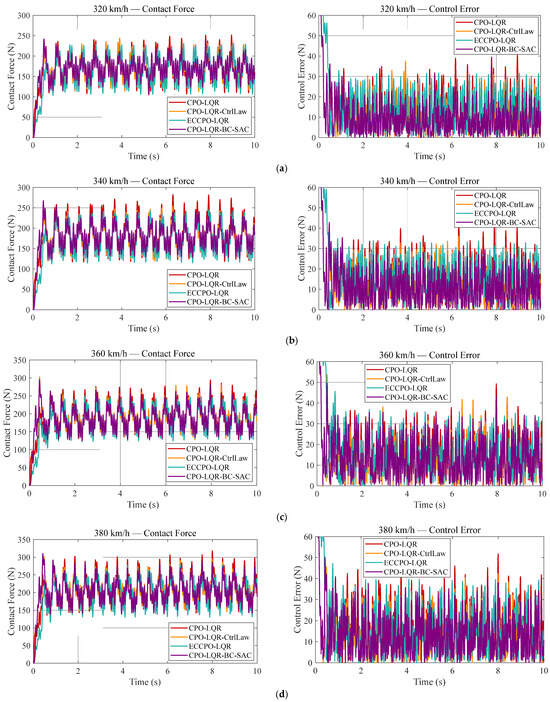 As previously described, to address the impracticality of deploying the dual-model offline control law directly, we propose superimposing the secondarily tuned baseline control actions onto the real-time CPO-LQR outputs, thereby achieving performance beyond that of standalone CPO-LQR. These tuned actions are treated as expert demonstrations for subsequent behavior cloning. In order to validate the effectiveness of expert action compensation and to demonstrate that the proposed framework outperforms pure expert action imitation, Figure 16 compares the performance of four control schemes under the 320 km/h, 340 km/h, 360 km/h, and 380 km/h conditions. Here, Expert-Compensated CPO-LQR (ECCPO-LQR) refers to the control framework that relies entirely on -based compensation.