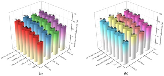 Control performance comparison of all the control schemes under various speed conditions. (a) Comparison of standard deviation reduction rates. (b) Comparison of control error reduction rates.