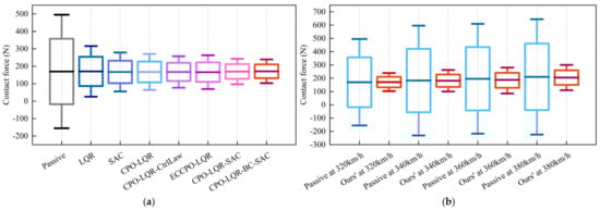 Based on the statistical contact force ranges discussed in Section 2.3.1, we compared the statistical distribution range of contact force under each control scheme at 320 km/h, as shown in Figure 18a. Similarly, we also compared the statistical contact force ranges under passive control and the proposed framework across all four speed conditions, as shown in Figure 18b. Whether examined by control scheme (Figure 18a) or by speed condition (Figure 18b), the statistical contact force ranges under the proposed framework consistently remain close to the target value, whereas in the passive control scenario, this range is markedly wider. These results further confirm the superior performance of the proposed compensation control framework in suppressing contact force fluctuations.