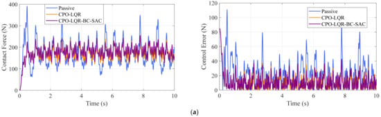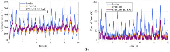 The final execution mode of this framework operates via the closed-loop synergistic control architecture (Figure 6-Part III): Contact force states are synchronously input to both the CPO-LQR baseline controller and BC-SAC compensator through dual feedback pathways. Here, the baseline controller will be regarded as the primary controller. The BC-SAC algorithm generates compensatory actions based on real-time states, which are synthesized with the primary controller output to form the composite control input as . Meanwhile, the feedback variables fed into the CPO-LQR dynamically incorporate the contact-force response after compensation, forming a dynamically optimized closed loop together with the BC-SAC compensator.