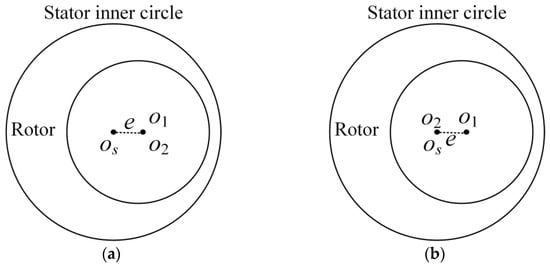 Rotor eccentricity is one of the most common mechanical faults in electrical machines. Dynamic eccentricity occurs when the rotor geometric center O1 does not coincide with the rotational center O2, while static eccentricity refers to cases where the rotor geometric center is offset from its nominal position but remains aligned with the rotational center.