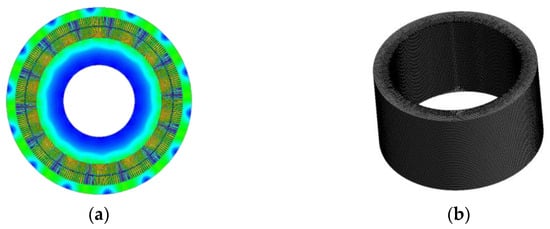 The calculation of stator core natural frequencies forms the foundation for analyzing motor vibration characteristics. This paper conducts subsequent research using a 300 MW DFIM as a case study. Table 1 shows the main parameters of the prototype. Figure 2 displays the established 2D electromagnetic finite element model coupled with the 3D mechanical model of the stator core, demonstrating the integrated simulation approach for electromechanical analysis. The 3D model of the stator core is discretized into 540,540 elements with 2,797,022 nodes, achieving an average mesh metric of 0.76.