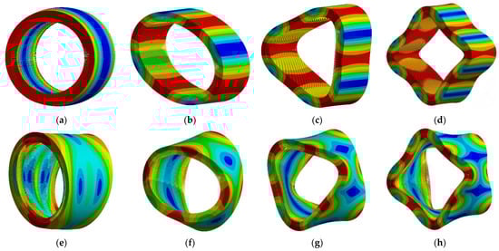 Stator core modal shapes: (a) radial order 0; (b) radial order 2; (c) radial order 3; (d) radial order 4; (e) axial 0 order; (f) axial 2 order; (g) axial 3 order; and (h) axial 4 order.