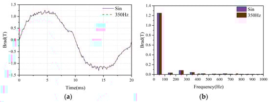 As evident from Figure 5, the air-gap flux density waveforms exhibit minimal variation between the two excitation modes, standard sinusoidal current and harmonic-injected current, with nearly identical fundamental amplitudes. Under harmonic excitation, distinct 400 Hz and 750 Hz spectral components emerge in the flux density, corresponding to the converter’s switching frequency and its first integer multiple, respectively.